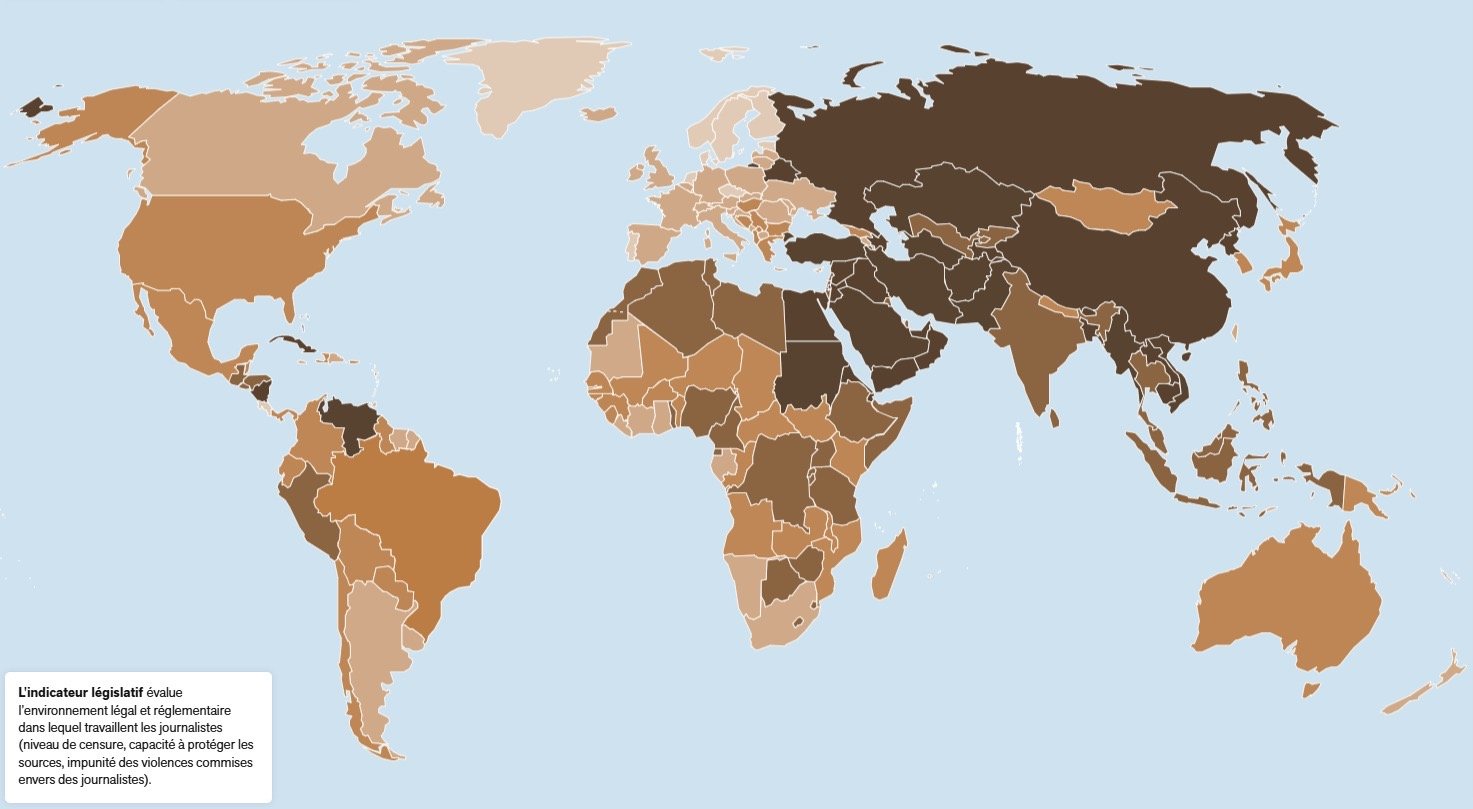 L’indicateur législatif du classement sur la liberté de la presse, en 2025, évalue des résultats allant de 8,35 pour le pire des cas, l’Erythrée, jusqu’à 91,96 pour la Norvège | ©Reporters sans frontières